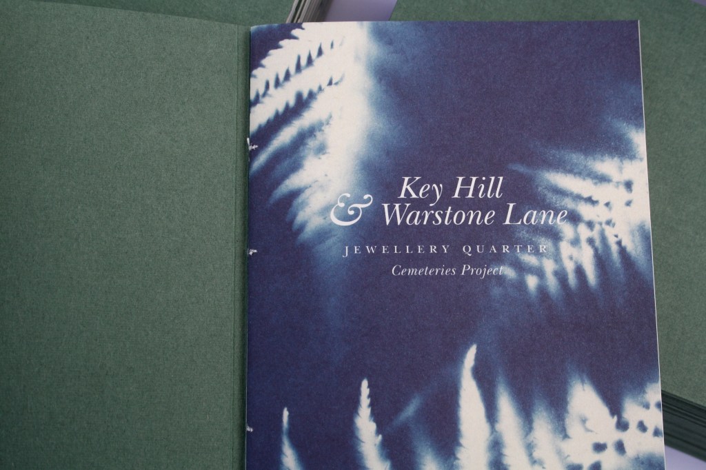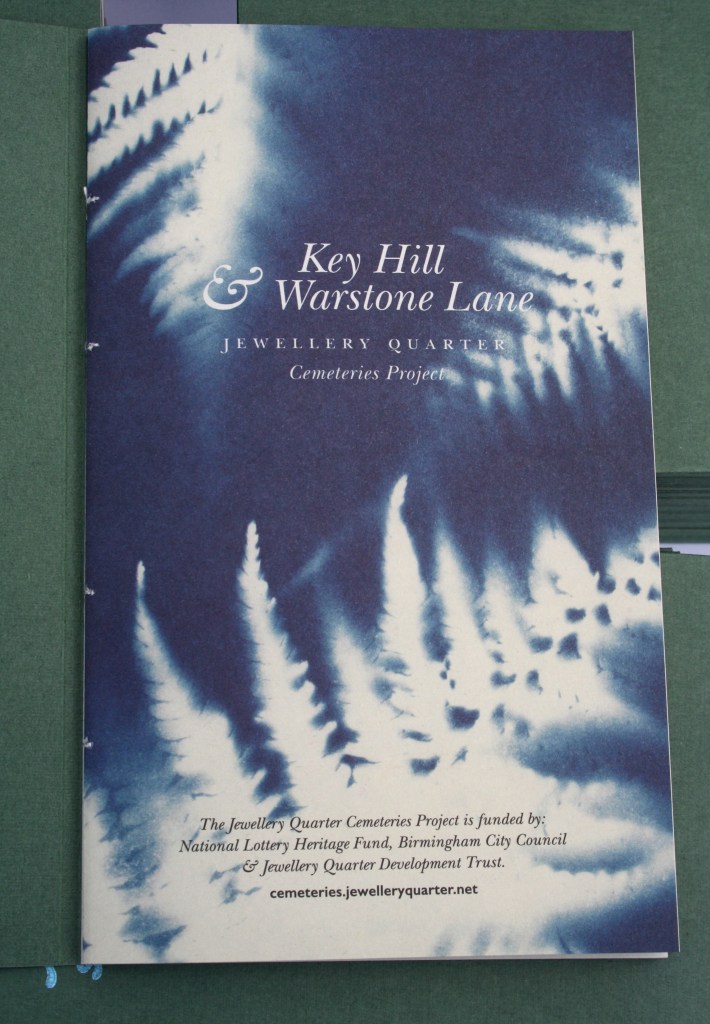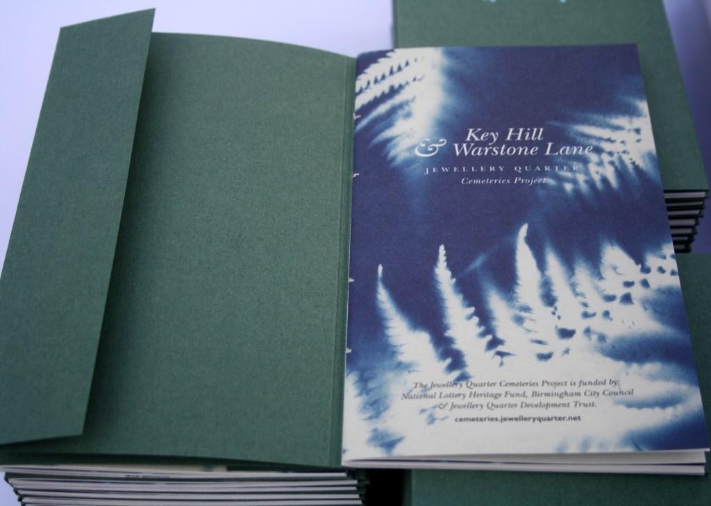 as we were opening up during lockdown I was grieving the loss of my mum. i managed to get a commission from the Jewellery Quarter Cemeteries Project, to develop a guide some of the symbolism to be found there. I collaborated with Lock up press in walsall to letterpress and make handmade books with peter cartwright. We produced 40 limited edition artist books and they were auctioned and sold via the cemeteries fundraising events to raise money for the project. We of course used the font baskerville as John BAskerville, (d.1775) is buried – after a bit of a journey – in Warstone lane Cemetery.