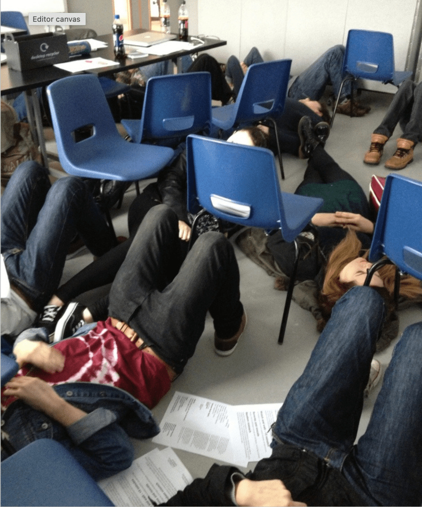 Pictured are some of the 50 Derby uni graphic design BA, year 1 students trying some horizontal brainstorming in my visual problem solving session. After the initial shock and sniggers they embraced the shift of approach and lay there for quite a while looking thoughtful. A couple of students later said that the state of mind there was free floating and productive; felt less pressured or rational than sitting staring at a blank page to generate ideas for the new brief they had just read – a type-led, A1 posters for an art exhibition.