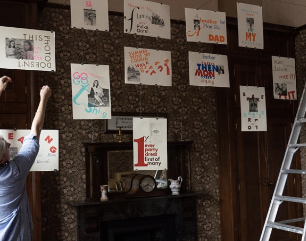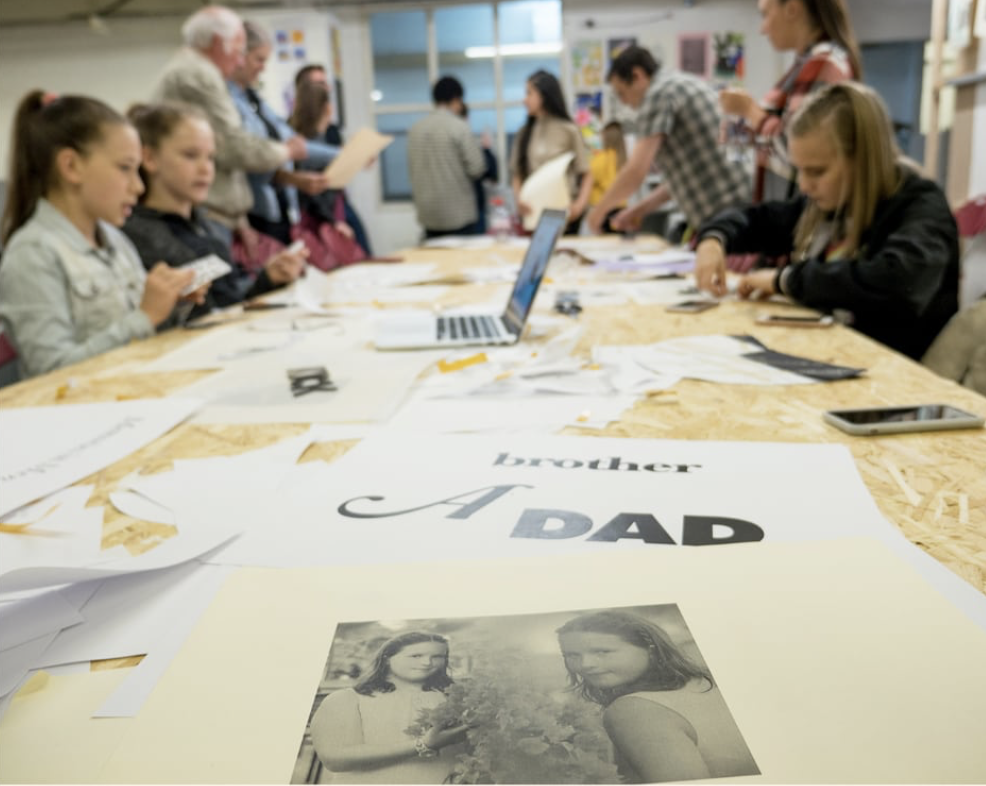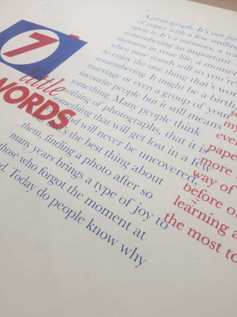 Above is A VISUAL EXPERIMENT MADE DURING A PROJECT I WAS WORKING ON WITH RICHARD FRANKS OF WE CAN CREATE TO CAPTURE AND SHARE THE HISTORY OF OUR REGION. PEOPLE’S MEMORIES AND STORIES WERE COLLECTED AND SHARED OVER A LONG PERIOD OF TIME AND IN meaningful CREATIVE WAYS. I helped to design one of the books for this project. and Below you can see me working with the elderly and school children to develop their ideas for typesetting a chosen seven words which would describe a chosen photo. We then took their ideas further with them, and printed it using riso, and staged an exhibition. Read about the project at LIVING MEMORY